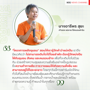 “โครงการพลังชุมชน” ที่จัดโดยเอสซีจี สอนให้เรารู้จักคำว่าแบ่งปันให้กับสังคมและชุมชน เราจึงมีแนวคิดว่า ไม่สามารถเติบโตได้โดยลำพัง ต้องรู้จักแบ่งปันให้กับชุมชน สังคม และคนรอบข้าง เพื่อที่จะเติบโตไปด้วยกัน ช่วยสร้างความสุขและความยั่งยืนอย่างเป็นรูปธรรม ซึ่งความท้าทายก็คือ การวางแผนที่จะทำอย่างไรให้เกิดความยั่งยืน และชุมชนโดยรอบ สามารถอยู่ได้ในระยะยาว โดยทุกวันนี้ทางฟาร์มเปิดให้คนทั่วไปที่สนใจเข้ามาเยี่ยมเยียนและศึกษาเรียนรู้การทำเกษตรแบบครบวงจร ตั้งแต่ต้นน้ำ กลางน้ำและปลายน้ำ พร้อมจะถ่ายทอดความรู้ คำแนะนำในทุกเรื่อง” นางอารีพร กล่าว
