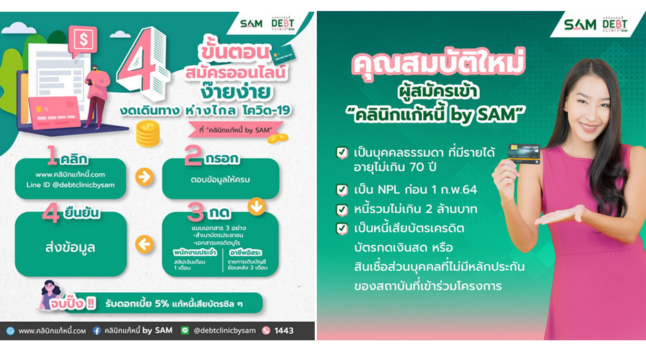 “คลินิกแก้หนี้ by SAM” รับโควิด-19 ทำหนี้พุ่ง ทุบดอกเบี้ยบัตรเหลือ 5% ต่อปี พร้อมต่อยาสูตร “จ่ายเท่าที่ไหว” กู้วิกฤตคนเป็นหนี้เสียบัตรเครดิต บัตรกดเงินสด วอนลูกค้ารักษาสถานะตนเอง จ่ายเท่าที่ไหวไม่เว้นงวด