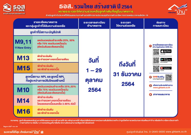 ธนาคารอาคารสงเคราะห์ ประกาศให้ลูกค้าเดิมที่อยู่ในมาตรการและยังคงได้รับผลกระทบด้านรายได้จาก COVID-19 ลงทะเบียนแจ้งความประสงค์เพื่อขอขยายระยะเวลาความช่วยเหลือผ่าน 8 มาตรการ ตาม “โครงการ ธอส. รวมไทย สร้างชาติ” ครอบคลุมทั้งการแบ่งจ่ายเงินงวดผ่อนชำระ (ตัดเงินต้น-ตัดดอกเบี้ย) พักชำระเงินต้นและจ่ายเฉพาะดอกเบี้ย และพักชำระเงินต้นและพักชำระดอกเบี้ย ลงทะเบียนแจ้งความประสงค์ผ่าน Application : GHB ALL หรือ GHB Buddy บน Application Line ภายใน 29 ตุลาคม 2564