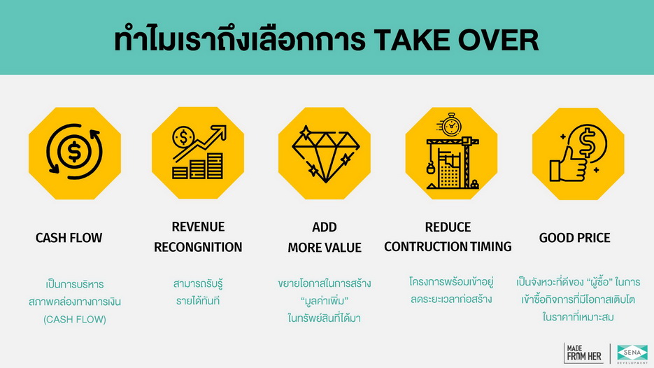 ขณะเดียวกัน ทางเสนา ยังคงเดินเกมตามพันธกิจต้นปีที่วางไว้ภายใต้มาตรการ “SENA Strong” พร้อมปรับตัว ปรับกลยุทธ์ใหม่ให้เหมาะกับสถานการณ์และกำลังซื้อในปัจจุบัน และเพื่อเป็นการสร้างโอกาสใหม่ ๆให้กับธุรกิจ โดยที่ผ่านมาเน้นซื้อที่ดินเปล่ามาพัฒนาเองตั้งแต่เริ่มลงเสาเข็ม แต่ปัจจุบันด้วยสถานการณ์ทางเศรษฐกิจทำให้มีโครงการที่มีปัญหาขาดสภาพคล่องทางการเงินไปต่อไปไม่ได้หลายโครงการ ทำให้ทางเสนาเห็นโอกาสในการขยายธุรกิจด้วยการเข้าเทคโอเวอร์โครงการที่อยู่ระหว่างก่อสร้าง ซึ่งข้อดีคือ ประหยัดทั้งเวลาและต้นทุน สามารถรับรู้รายได้ได้เร็ว ที่สำคัญคือ โครงการเหล่านี้อยู่บนทำเลที่ดีมีศักยภาพและบางโครงการมาพร้อมกับลูกค้าเก่าที่เตรียมพร้อมโอนแล้ว แต่ที่ผ่านมาอาจติดเรื่องเงินทุนหมุนเวียนเท่านั้น