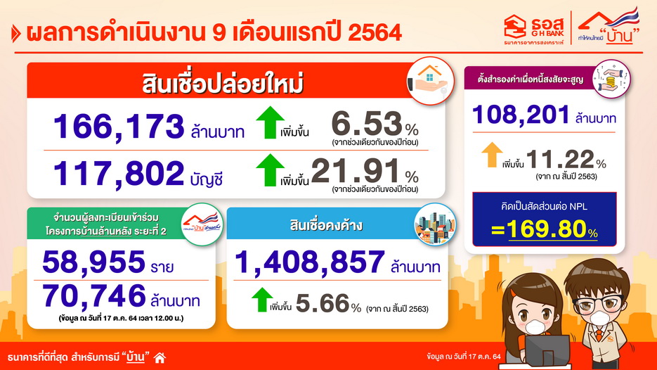 ธนาคารอาคารสงเคราะห์ เปิดผลการดำเนินงานในช่วง 9 เดือนแรกของปี 2564 ปล่อยสินเชื่อใหม่ได้ 166,173 ล้านบาท 117,802 บัญชี เพิ่มขึ้น 6.53% จากช่วงเดียวกันของปี 2563 สินเชื่อคงค้างรวม 1,408,857 ล้านบาท สินทรัพย์รวม 1,455,358 ล้านบาท มีหนี้ที่ไม่ก่อให้เกิดรายได้ (NPL) 4.52% และมีเงินสำรองจำนวน 108,201 ล้านบาท คิดเป็นสัดส่วนต่อ NPL สูงถึง 169.80% ขณะที่ผู้ลงทะเบียนโครงการบ้านล้านหลัง ระยะที่ 2 ล่าสุด ณ วันที่ 17 ตุลาคม 2564 อยู่ที่ 58,955 ราย คิดเป็นวงเงินสินเชื่อ 70,746 ล้านบาท พร้อมช่วยเหลือลูกค้าที่ได้รับผลกระทบจาก COVID-19 อย่างต่อเนื่อง โดยนับตั้งแต่ปี 2563 ถึงปัจจุบันเป็นระยะเวลา 21 เดือน มีจำนวนลูกค้าเข้ามาตรการช่วยเหลือของ ธอส. รวมสูงสุดถึง 968,555 บัญชี เงินต้นคงเหลือ 842,056 ล้านบาท