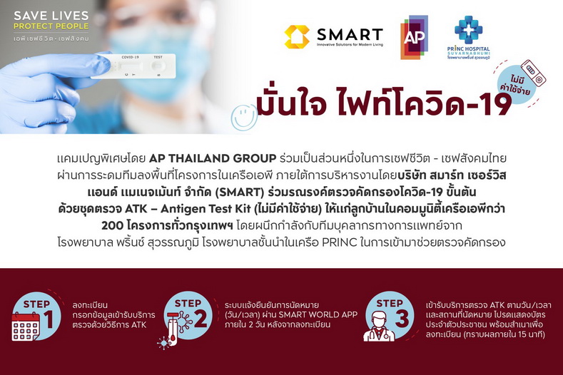 เอพี ไทยแลนด์ กรุ๊ป ภายใต้พันธกิจ ‘EMPOWER LIVING’ นำโดย (กลาง) นางสาวทิพวรรณ ศิริคูณ ผู้ช่วยกรรมการผู้อำนวยการ สายงานทรัพยากรบุคคล เปิดตัวแคมเปญพิเศษ ‘มั่นใจ ไฟท์โควิด-19’ สานต่อพลังร่วมเซฟชีวิตเซฟสังคมต่อเนื่อง ผ่านการระดมทีมลงพื้นที่โครงการในเครือเอพี ภายใต้การบริหารงานโดยบริษัท สมาร์ท เซอร์วิส แอนด์ แมเนจเม้นท์ จำกัด (SMART) ร่วมรณรงค์ตรวจคัดกรองโควิด-19 ขั้นต้นด้วยชุดตรวจ ATK – Antigen Test Kit ให้แก่ลูกบ้านในคอมมูนิตี้เครือเอพีกว่า 200 โครงการทั่วกรุงเทพฯ (ไม่มีค่าใช้จ่าย) โดยผนึกกำลังกับทีมบุคลากร ทางการแพทย์จากโรงพยาบาล พริ้นซ์ สุวรรณภูมิ โรงพยาบาลชั้นนำในเครือ PRINC ในการเข้ามาช่วย  ตรวจคัดกรอง เพื่อมุ่งหวังเป็นส่วนหนึ่งในการร่วมแบ่งเบาสถานการณ์การแพร่ระบาดโควิด-19 ของประเทศ พร้อมทั้งเสริมสร้างความมั่นใจและความอุ่นใจในการอยู่อาศัยในเอพีคอมมูนิตี้นี้ไปด้วยกัน นำร่อง 4 โครงการแรกที่ LIFE ลาดพร้าว, Aspire อโศก – รัชดา, บ้านกลางเมือง สวนหลวง และ Pleno พหลโยธิน – วัชรพล (ถ่ายภาพ ณ  โครงการ LIFE ลาดพร้าว)