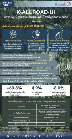 กองทุน K-ALLROAD-UI เป็นกองทุนสำหรับผู้ลงทุนสถาบันและผู้ลงทุนรายใหญ่พิเศษเท่านั้น มีระยะเวลาการลงทุนอย่างน้อย 5 ปีขึ้นไป หากต้องการผลตอบแทนสูงกว่ากองทุนตลาดเงินหรือเงินฝาก เสนอขายระหว่างวันที่ 28 ตุลาคม – 9 พฤศจิกายน 2564 สอบถามข้อมูลบริการเพิ่มเติมติดต่อไพรเวทแบงค์เกอร์ที่ดูแลหรือติดต่อ KBank Private Banking Contact Center 02-8888811
