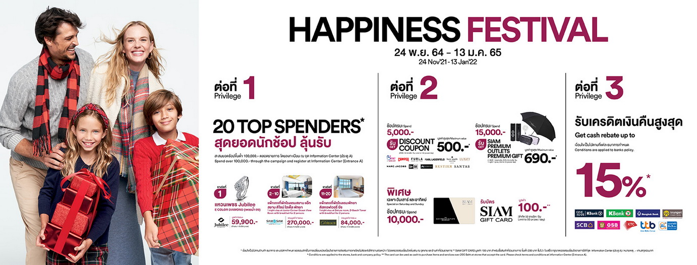 เทศกาลแห่งความสุขเริ่มต้นขึ้นแล้วที่ สยาม พรีเมี่ยม เอาท์เล็ต กรุงเทพ (Siam Premium Outlets Bangkok) พรีเมียมเอาท์เล็ตแห่งแรก-แห่งเดียวในเมืองไทย มาตรฐานเอาท์เล็ตระดับโลก เดินสบาย ในบรรยากาศปลอดโปร่ง และยกระดับความมั่นใจด้วยมาตรฐาน SHA Plus ที่มอบความปลอดภัยในสุขอนามัยให้แก่เหล่านักช้อปได้จับจ่ายอย่างเพลิดเพลิน พร้อมเฉลิมฉลองส่งท้ายปีกับแคมเปญ “HAPPINESS FESTIVAL” ช้อปสุขสันต์แบบสุดคุ้ม จัดหนักของรางวัลพิเศษมากมาย ทั้งแหวนเพชร แพ็กเกจที่พักชื่อดัง บัตรกำนัลจากร้านค้าแบรนด์เนมชั้นนำ รวมมูลค่ากว่า 2 ล้านบาท และเครดิตเงินคืนจากบัตรเครดิตที่ร่วมรายการสูงสุด 15% เตรียมตัวมาช้อปให้สุขใจได้ตั้งแต่วันที่ 24 พฤศจิกายน 2564 – 13 มกราคม 2565