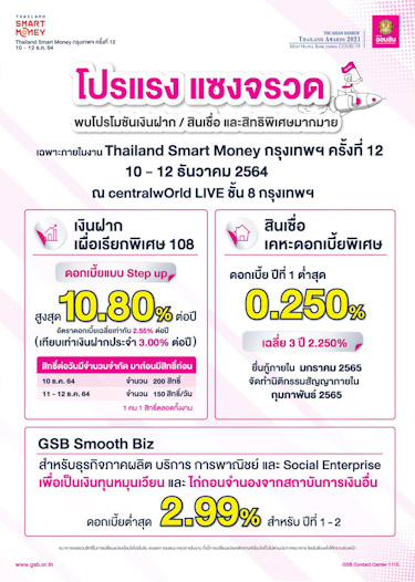 ธนาคารจึงขอเชิญชวนลูกค้าและประชาชนผู้สนใจ เยี่ยมชมงาน Thailand Smart Money กรุงเทพฯ ที่ CentralwOrld LIVE HALL ชั้น 8 และใช้บริการทางการเงินต่าง ๆ ที่บูธธนาคารออมสิน ด้วยโปรโมชันน่าสนใจส่งท้ายปี 2564 โดยทุกธุรกรรมและกิจกรรมต่าง ๆ มีของที่ระลึกและรางวัลพิเศษสุดเฉพาะลูกค้าในงานเท่านั้น