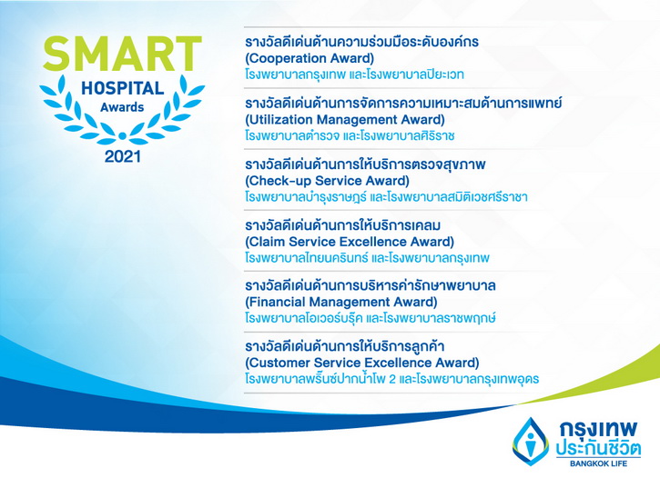 บริษัท กรุงเทพประกันชีวิต จำกัด (มหาชน) จัดงานมอบรางวัล Bangkok Life SMART Hospital Awards 2021 เชิดชูเกียรติโรงพยาบาลคู่สัญญาบริการประกันสุขภาพที่มีความโดดเด่นใน 6 สาขา รวม 11 โรงพยาบาล สร้างมาตรฐานการประกันสุขภาพระดับสากล เพื่อมอบบริการที่ดีที่สุดให้แก่ลูกค้าและประโยชน์สู่สังคม