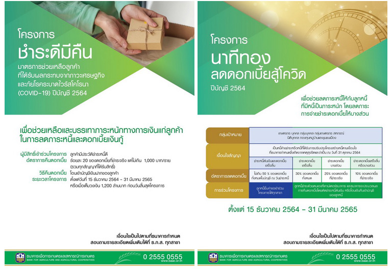 และโครงการนาทีทองลดดอกเบี้ยสู้โควิด ปีบัญชี 2564 สำหรับลูกค้าที่มีภาระหนี้ค้างชำระ หรือลูกค้าที่ปรับปรุงโครงสร้างหนี้ ณ วันที่ 31 ตุลาคม 2564 โดย ธ.ก.ส. จะลดดอกเบี้ย ดังนี้ 1) กรณีชำระหนี้เสร็จสิ้นเป็นรายสัญญา จะลดดอกเบี้ยที่ค้างชำระรวมถึงเบี้ยปรับ ไม่เกินร้อยละ 50 ณ วันชำระหนี้ 2) กรณีชำระดอกเบี้ยได้เสร็จสิ้น แต่ไม่สามารถชำระต้นเงินได้ จะลดดอกเบี้ยค้างชำระรวมถึงเบี้ยปรับ ร้อยละ 30 ของดอกเบี้ยที่ชำระจริง 3) กรณีชำระดอกเบี้ยได้บางส่วนจะลดดอกเบี้ยค้างชำระรวมถึงเบี้ยปรับ ร้อยละ 20 ของดอกเบี้ยที่ชำระจริง 4) กรณีกลุ่มเกษตรกรสหกรณ์ นิติบุคคล และกองทุนหมู่บ้านและชุมชนเมือง ที่ชำระดอกเบี้ยได้เสร็จสิ้นหรือบางส่วน จะลดดอกเบี้ยค้างชำระรวมถึงเบี้ยปรับ ร้อยละ 10 ของดอกเบี้ยที่ชำระจริง