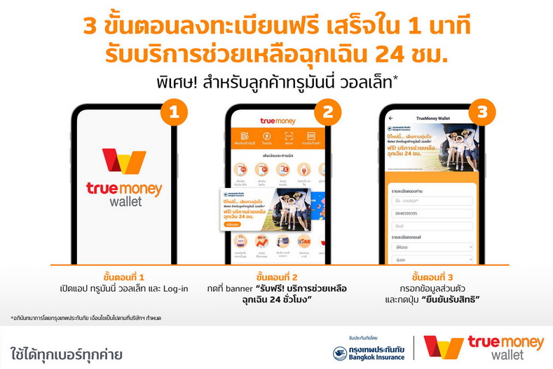 - บริษัท ทรูมันนี่ จำกัด ทำหน้าที่เป็นเพียงช่องทางในการสื่อสารเพื่อให้ทางกรุงเทพประกันภัยได้มอบบริการช่วยเหลือฉุกเฉินดังกล่าว ให้กับผู้ใช้บริการทรูมันนี่ วอลเล็ท ที่ยืนยันตัวตนแล้วเท่านั้น บริษัทฯ ไม่มีส่วนเกี่ยวข้องกับการพิจารณา อนุมัติ รวมถึงขั้นตอนการมอบบริการดังกล่าว