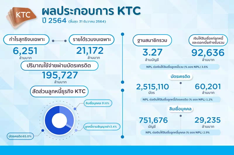 เคทีซีพอใจผลกำไรงบเฉพาะปี 2564 สร้างสถิติใหม่อีกครั้งที่ 6,251 ล้านบาท เติบโต 17.2% แม้ต้องเผชิญกับวิกฤติโควิด-19 และการลดเพดานอัตราดอกเบี้ยของสินเชื่อบัตรเครดิตและสินเชื่อบุคคลต่อเนื่อง ทำให้พอร์ตลูกหนี้รวมโตไม่มากเท่าที่ควร เล็งปี 2565 สบช่องจากแนวโน้มเศรษฐกิจฟื้นตัว และการใช้จ่ายของผู้บริโภคส่งสัญญาณดีขึ้น สร้างโอกาสให้ธุรกิจสินเชื่อมีหลักประกันเติบโต ตั้งเป้าปี 2565 ผลักดันพอร์ตลูกหนี้รวมโตเกิน 100,000 ล้านบาท และจะทำกำไรได้สูงสุดอีกครั้ง
