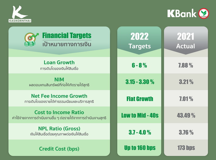 • การเติบโตของเงินให้สินเชื่อ (Loan Growth) ที่ 6-8% จากการเติบโตสินเชื่อในกลุ่มลูกค้าบุคคลและกลุ่มลูกค้าธุรกิจเอสเอ็มอี โดยเน้นการนำเสนอผลิตภัณฑ์สินเชื่อผ่านช่องทางดิจิทัลเพิ่มขึ้น ควบคู่กับการนำข้อมูลมาใช้วิเคราะห์ในการปล่อยสินเชื่อ (Data Analytics) การร่วมมือกับพันธมิตร และการเติบโตสินเชื่อในภูมิภาค AEC+3 อีกทั้ง ธนาคารยังคงให้ความช่วยเหลือลูกค้าที่ได้รับผลกระทบจากสถานการณ์โควิด 19 อย่างต่อเนื่อง ทั้งนี้ สินเชื่อลูกค้าบุคคลคาดว่าจะเติบโต 9-11% สินเชื่อธุรกิจเอสเอ็มอีคาดว่าจะเติบโต 4-6% และสินเชื่อบรรษัทธุรกิจคาดว่าจะเติบโต 1-3%