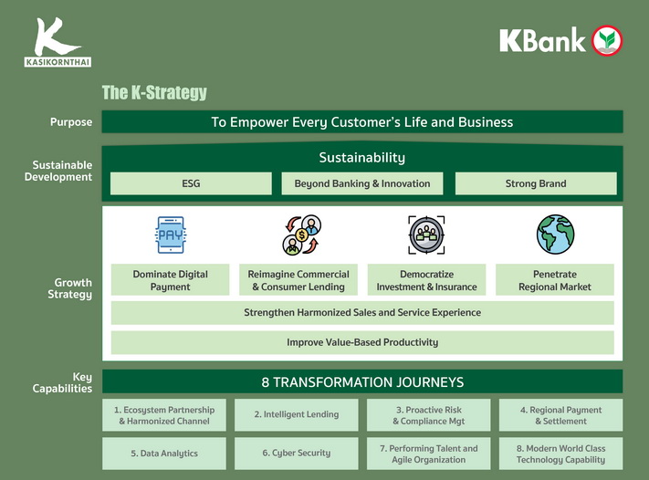6.เพิ่มประสิทธิภาพในการทำงานเพื่อสร้างคุณค่าที่มาจากการใช้ทรัพยากรที่มีประสิทธิภาพทั้งทรัพยากรบุคคล ข้อมูล การเงิน และเทคโนโลยี (Improve Value-Based Productivity) อย่างมีประสิทธิภาพสูงสุด เนื่องจากการเปลี่ยนแปลงของเทคโนโลยี พฤติกรรมผู้บริโภค และสภาพแวดล้อมในการแข่งขัน  สิ่งสำคัญที่จะทำให้ธนาคารสามารถตอบโจทย์ลูกค้าได้ตามยุทธศาสตร์ที่วางไว้คือต้อง “อยู่ในที่ที่ลูกค้าอยู่ (Be where customers are)” ด้วยการร่วมมือกับพันธมิตรทางธุรกิจใน Ecosystem ต่างๆ ซึ่งธนาคารดำเนินการมาอย่างต่อเนื่อง โดยมีแผนที่จะพัฒนาความร่วมมือใหม่ๆ เพื่อเพิ่มโอกาสในการขยายฐานลูกค้ากลุ่มที่ธนาคารยังเข้าถึงได้น้อย โดยเฉพาะลูกค้ารายเล็ก และขยายธุรกิจในบริการทางการเงินซึ่งมีผลตอบแทนสูง