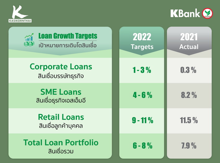 • การเติบโตของเงินให้สินเชื่อ (Loan Growth) ที่ 6-8% จากการเติบโตสินเชื่อในกลุ่มลูกค้าบุคคลและกลุ่มลูกค้าธุรกิจเอสเอ็มอี โดยเน้นการนำเสนอผลิตภัณฑ์สินเชื่อผ่านช่องทางดิจิทัลเพิ่มขึ้น ควบคู่กับการนำข้อมูลมาใช้วิเคราะห์ในการปล่อยสินเชื่อ (Data Analytics) การร่วมมือกับพันธมิตร และการเติบโตสินเชื่อในภูมิภาค AEC+3 อีกทั้ง ธนาคารยังคงให้ความช่วยเหลือลูกค้าที่ได้รับผลกระทบจากสถานการณ์โควิด 19 อย่างต่อเนื่อง ทั้งนี้ สินเชื่อลูกค้าบุคคลคาดว่าจะเติบโต 9-11% สินเชื่อธุรกิจเอสเอ็มอีคาดว่าจะเติบโต 4-6% และสินเชื่อบรรษัทธุรกิจคาดว่าจะเติบโต 1-3%