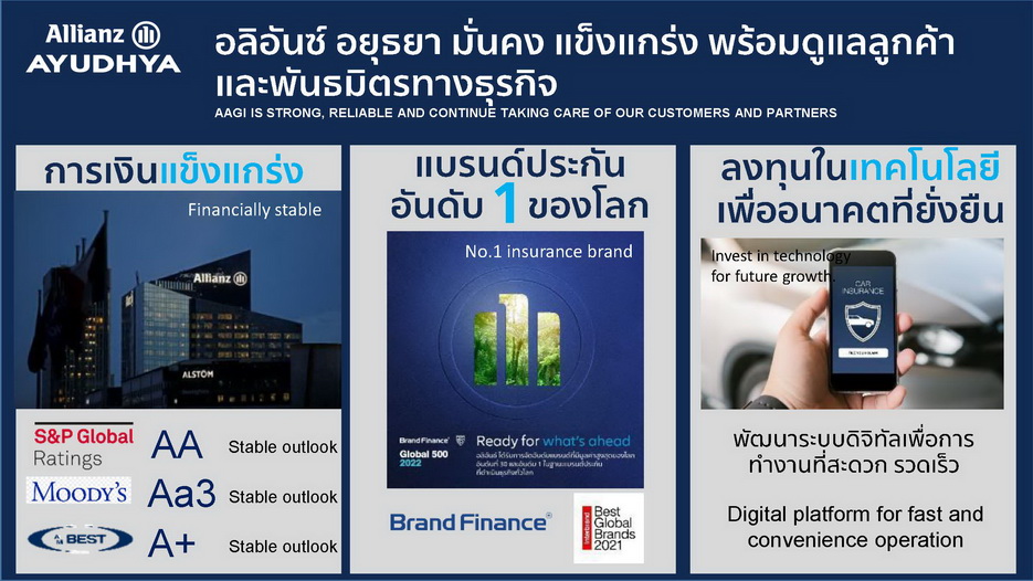 มร. ลาร์ส ไฮบุทสกี้ กรรมการผู้จัดการใหญ่และประธานเจ้าหน้าที่บริหาร บมจ. อลิอันซ์ อยุธยา ประกันภัย กล่าวว่า อลิอันซ์ อยุธยา ประกันภัย เป็นส่วนหนึ่งของกลุ่มอลิอันซ์ บริษัทประกันภัยชั้นนำของโลกที่มั่นคง แข็งแกร่ง การันตีด้วยเรทติ้งที่ดีเยี่ยมจากสถาบันการเงินมากมาย ส่งผลให้สถานะทางการเงินแข็งแกร่งด้วยสินทรัพย์กว่า 1 หมื่นล้านบาท และมีเงินกองทุนสำรอง (Risk-based capital) สูงกว่ามาตรฐานถึง 452% (ณ วันที่ 31 ธันวาคม 2564) เมื่อผสานกับความรู้ความเข้าใจในตลาดประเทศไทย พร้อมนวัตกรรมเทคโนโลยี ทำให้มั่นใจได้ว่าสามารถส่งมอบผลิตภัณฑ์และประสบการณ์ที่ดีที่สุดให้กับลูกค้าได้ พิสูจน์จากผลการดำเนินงานของเราที่ถึงแม้จะอยู่ในสถานการณ์วิกฤตโควิด 19 แต่ก็ยังสามารถสร้างผลงานตามเป้า โดยรายได้ มาจากผลิตภัณฑ์ประกันยนต์ (motor) และผลิตภัณฑ์ที่ไม่ใช่ประกันรถยนต์ (none-motor) เป็นสัดส่วนเท่าๆกัน