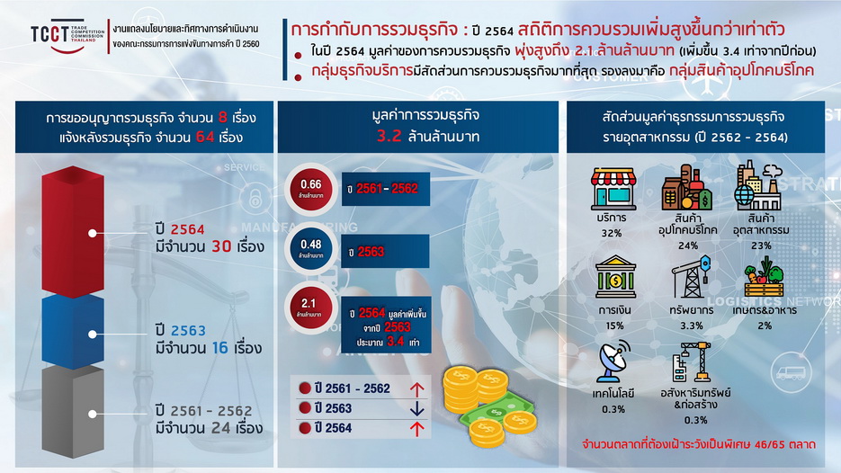 ศาสตราจารย์สกนธ์ วรัญญูวัฒนา ประธานกรรมการการแข่งขันทางการค้า เปิดเผยว่า การกำกับดูแลการแข่งขันทางการค้าตามพระราชบัญญัติการแข่งขันทางการค้า พ.ศ. 2560 ตั้งแต่ปี 2561 – 2564 ได้รับเรื่องร้องเรียนรวมทั้งสิ้น 134 เรื่อง โดยในปี 2564 มีการรับเรื่องร้องเรียนสูงสุดถึง 71 เรื่อง เพิ่มขึ้นจากปี 2563 ประมาณ 2.36 เท่า กลุ่มธุรกิจที่มีการรับเรื่องร้องเรียนมากที่สุดคือ ธุรกิจพาณิชย์อิเล็กทรอนิกส์ (Platform) จำนวน 40 เรื่อง รองลงมาคือธุรกิจแฟรนไชส์และธุรกิจบริการอื่นๆ จำนวน 15 เรื่อง และธุรกิจการผลิตและการค้าส่งค้าปลีกจำนวน 16 เรื่อง และเมื่อจำแนกตามพฤติกรรมพบว่าเป็นการใช้อำนาจเหนือตลาดโดยมิชอบจำนวน 40 เรื่อง การปฏิบัติทางการค้าที่ไม่เป็นธรรมจำนวน 28 เรื่อง และการตกลงร่วมกัน จำนวน 3 เรื่อง โดยได้ดำเนินคดีอาญา จำนวน 3 เรื่อง ผู้ต้องหาจำนวน 28 ราย อยู่ระหว่างส่งฟ้องอัยการ จำนวน 2 ราย และผู้ต้องหาขอเปรียบเทียบปรับตามกฎหมายจำนวน 26 ราย ในส่วนของคดีปกครองมีการลงโทษทางปกครองจำนวน 11 เรื่อง ผู้กระทำความผิด จำนวน 16 ราย มีค่าปรับรวมประมาณ 34 ล้านบาท นอกจากนี้ ในปี 2564 เป็นปีที่มีการรวมธุรกิจมากที่สุดถึง 32 เรื่อง เพิ่มขึ้นจากปี 2563 ประมาณ 2 เท่า และมีมูลค่าการรวมธุรกิจประมาณ 2.1 ล้านล้านบาท เพิ่มขึ้นประมาณ 3.4 เท่า