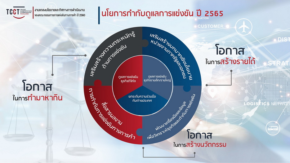 คณะกรรมการการแข่งขันทางการค้า จึงได้กำหนดนโยบายและทิศทางการกำกับการแข่งขันทางการค้า ปี 2565 ได้แก่ 1.การกำกับดูแลการแข่งขันในธุรกิจพาณิชย์อิเล็กทรอนิกส์ (Platform) ทุกรูปแบบ ซึ่งมีการขยายตัวอย่างรวดเร็ว เนื่องจากสามารถให้บริการลูกค้าได้อย่างมีประสิทธิภาพในระบบเศรษฐกิจดิจิทัลที่ผู้บริโภคไม่นิยมใช้เงินสด โดยในปี 2564 มีมูลค่าทางธุรกิจมากถึง 4 ล้านล้านบาท อาทิ การจำหน่ายสินค้าหรือบริการ (E-Market Place) การขนส่งสินค้า (E-Logistic) การให้บริการรับสั่งและจัดส่งอาหาร (Food Delivery) และธุรกิจจองโรงแรมที่พัก (OTA) ซึ่งผู้ประกอบธุรกิจส่วนใหญ่เป็นผู้ประกอบธุรกิจรายใหญ่จากต่างประเทศ 2. การกำกับดูแลการรวมธุรกิจ (M&A) โดยเฉพาะการควบรวมธุรกิจด้านเทคโนโลยีที่มีแนวโน้มเพิ่มมากขึ้นอย่างชัดเจน และ 3 การส่งเสริมและสร้างโอกาสให้ผู้ประกอบธุรกิจ SMEs สามารถแข่งขันได้มากขึ้น