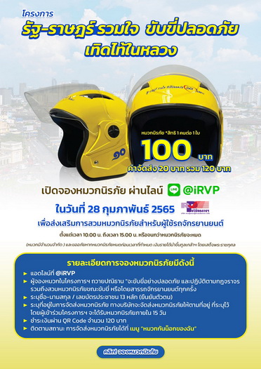 สำหรับประชาชนที่สนใจเข้าร่วมจองหมวกนิรภัยในโครงการ “รัฐ-ราษฎร์รวมใจ ขับขี่ปลอดภัย เทิดไท้ในหลวง” บริษัทกลางฯ จะเริ่มเปิดจองหมวกนิรภัย ผ่านไลน์แอด @iRVP ในวันที่ 28 กุมภาพันธ์ 2565 ตั้งแต่เวลา 10.00 – 15.00 น. (หรือจนกว่าหมวกนิรภัยจะหมด) โดยหมวกนิรภัยมีจำนวนจำกัด และขออภัยหากหมวกนิรภัยหมดก่อนเวลาที่กำหนด โดยประชาชนที่สนใจสามารถจองหมวกนิรภัยได้ 1 คนต่อ 1 ใบ