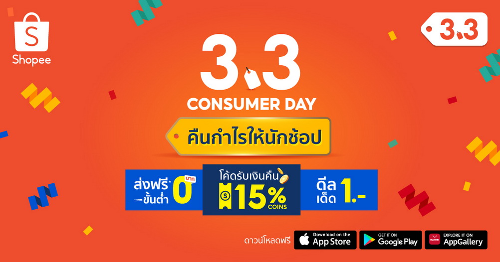เตรียมสะสม Shopee Coins กดแจ้งเตือนสินค้า Flash Sale และลงทะเบียนสมัครใช้งาน SPayLater ให้พร้อม แล้วไปสัมผัสปรากฏการณ์ความคุ้มค่าที่ดีต่อใจดีต่อเงินในกระเป๋าพร้อมกันในมหกรรม Shopee 3.3 Consumer Day คืนกำไรให้นักช้อป ในวันที่ 3 มีนาคม 2565 ที่ช้อปปี้ได้แท็กทีมร้านค้าและแบรนด์ชั้นนำบน Shopee Mall อาทิ L’Oreal Paris, Garnier, Maybelline, Hisense, Lotus Mattress, Dunlopillo, Tefal, Dodolove, และ Lotus’s และอีกมากมาย มาผนึกกำลังคืนกำไรให้นักช้อป พร้อมอัดโปรแรงแห่งปี ทั้งโค้ดส่งฟรีขั้นต่ำ 0 บาท โค้ดรับเงินคืน 15% coins และดีลเด็ด 1 บาท ที่ได้รวมสินค้าตัวดังมากมายมาลดสะบั้นหั่นราคาเหลือเพียง 1 บาท เท่านั้น ไม่ว่าจะเป็น สมาร์ทโฟน Xiaomi Redmi 10, ดิจิทัลทีวีขนาด 32 นิ้ว และตู้เย็นขนาด 3.4 Q จาก Hisense, เครื่องชงกาแฟสดจาก Duchess, เครื่องดูดไรฝุ่นจาก Deerma, Innisfree Green Tea Seed Serum, โซฟาปรับนอนได้จาก HAKONE เป็นต้น นอกจากนี้นักช้อปยังจะได้เต็มอิ่มไปกับสิทธิพิเศษเพิ่มเติมเมื่อชำระเงินผ่าน ShopeePay และ SPayLater