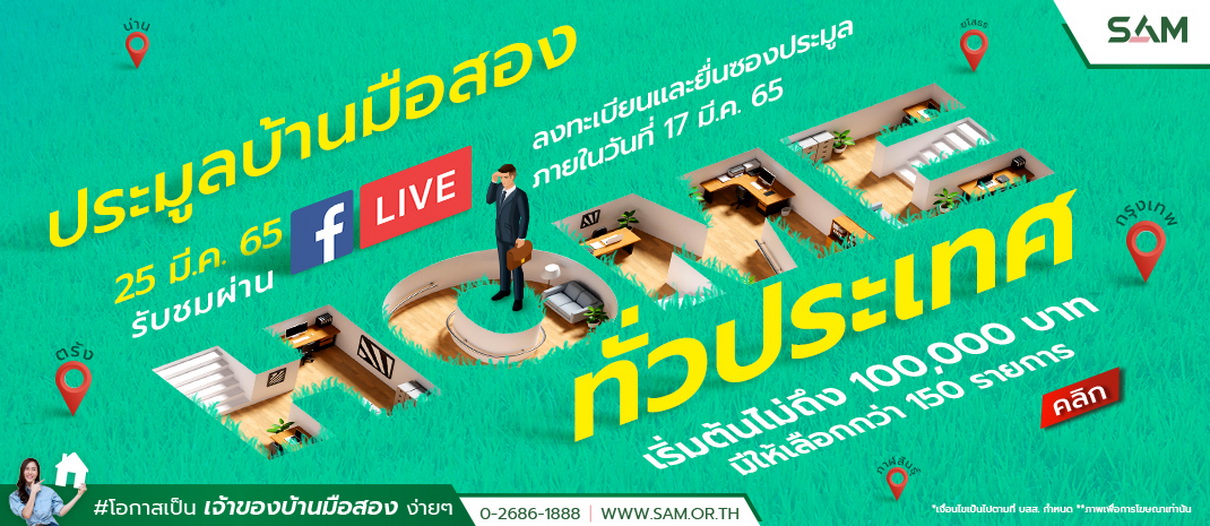 SAM จัดงานประมูลทรัพย์มือสองออนไลน์ คัดทรัพย์เด่นทั่วไทย ทั้งทรัพย์ลงทุนและอยู่อาศัย มากกว่า 150 รายการ มูลค่ารวมกว่า 1 พันล้านบาท เปิดซอง 25 มี.ค. นี้