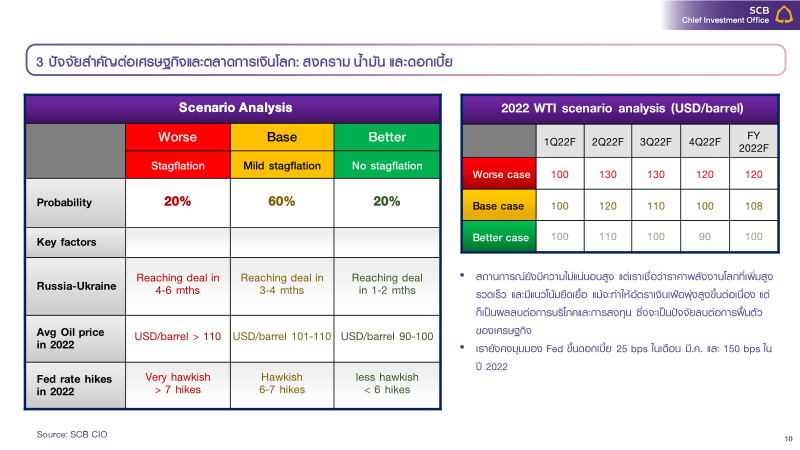 SCB CIO ประเมินสงครามระหว่างรัสเซีย-และยูเครนยังมีความไม่แน่นอนสูง มีแนวโน้มยืดเยื้อ เป็นความเสี่ยงต่อการฟื้นตัวของเศรษฐกิจโลกจากราคาพลังงานที่ปรับตัวสูงขึ้นอย่างต่อเนื่อง ทำให้เงินเฟ้อที่อยู่ในระดับสูงมีแนวโน้มยืดเยื้อเพิ่มมากขึ้น แต่ธนาคารกลางหลัก Fed และ ECB จะไม่ส่งสัญญาณเร่งขึ้นดอกเบี้ยเร็วและแรงจนเกินไป ยังคงมุมมองเพิ่มน้ำหนักการถือเงินสด ไม่ซื้อไม่ขายสินทรัพย์เสี่ยง จับจังหวะสะสมหุ้นไทยและเวียดนามเพื่อใช้เป็นหลุมหลบภัยในช่วงที่ตลาดมีความผันผวนสูง