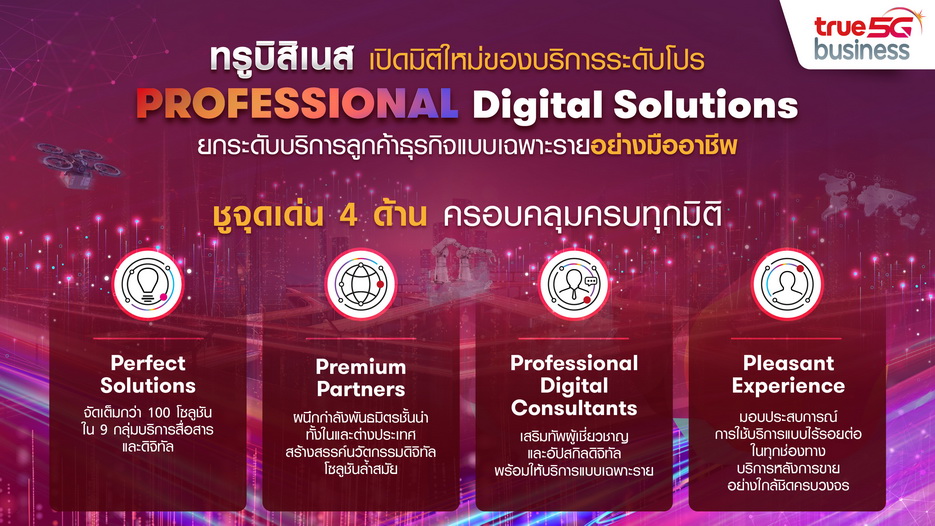 โดย ทรูบิสิเนส ผู้นำบริการสื่อสารและดิจิทัลโซลูชันครบวงจร ได้ก้าวไปอีกขั้นสู่มิติใหม่ของบริการระดับโปรสำหรับองค์กรและธุรกิจในยุคดิจิทัล ด้วยยุทธศาสตร์ Professional Digital Solutions ที่มุ่งยกระดับบริการดิจิทัลสำหรับลูกค้าธุรกิจแบบเฉพาะรายอย่างมืออาชีพ โดยใช้กลยุทธ์ 4 ด้านที่ครอบคลุมทุกความต้องการอย่างเหนือชั้น ประกอบด้วย Perfect Solutions การพัฒนาและสรรหาโซลูชันที่หลากหลายรองรับทุกรูปแบบการใช้งานของธุรกิจ Premium Partners ความร่วมมือกับพันธมิตรชั้นนำเพื่อพัฒนานวัตกรรมและสร้างระบบนิเวศดิจิทัลเพื่อองค์กรธุรกิจ รวมถึง Professional Digital Consultants การเพิ่มศักยภาพบุคลากรผู้เชี่ยวชาญที่มีความรู้และความชำนาญ เพื่อให้บริการลูกค้าอย่างมืออาชีพ และ Pleasant Experience บริการหลังการขายในหลากหลายช่องทางที่เชื่อมโยงแบบไร้รอยต่อ เพื่อมอบประสบการณ์การใช้บริการที่ดีที่สุดตลอดระยะเวลาการใช้บริการของ ทรูบิสิเนส