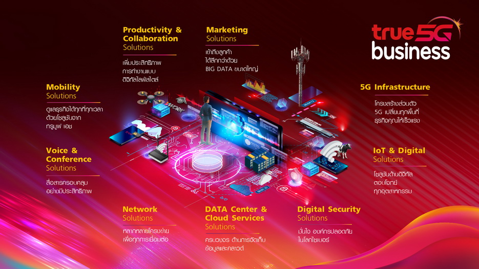 -5G Infrastructure เครือข่ายอัจฉริยะทรู 5G ที่่เร็วแรง ครบกว่า และครอบคลุมมากที่สุดทั่วไทย พร้อมรองรับทุกการใช้ชีวิต การเรียน การทำงาน รวมถึง 5G โซลูชันที่หลากหลายเพื่อการใช้งานในทุกอุตสาหกรรม
