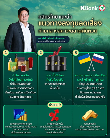 ดร. พิพัฒน์พงศ์ โปษยานนท์ กรรมการผู้จัดการ ธนาคารกสิกรไทย กล่าวว่า การลงทุนในปีนี้เป็นปีที่ท้าทายจากแรงกดดัน 3 ปัจจัยสำคัญคือ 1) กำลังการผลิตยังไม่กลับมาสู่ภาวะปกติ ภาคการผลิตยังได้รับผลกระทบจากสถานการณ์โควิด ไม่สามารถดำเนินการผลิตได้เต็มกำลัง ประกอบกับความต้องการสินค้าเพิ่มสูงขึ้นจากการเปิดประเทศ 2) การปรับตัวขึ้นของราคาน้ำมันโลกที่ปรับตัวสูงขึ้นจากความต้องการที่มากขึ้น ในขณะที่กำลังการผลิตมีจำกัด ส่งผลต่อภาวะเงินเฟ้อในระดับสูงจากราคาน้ำมันตลาดโลกปรับตัวอย่างผันผวน (Stagflation) 3) สถานการณ์ความตึงเครียดระหว่างรัสเซีย-ยูเครน ยังเห็นการใช้กำลังปะทะกันต่อเนื่อง และล่าสุด ประเทศสมาชิกสหภาพยุโรป (EU) กำลังพิจารณาคว่ำบาตรน้ำมันรัสเซียตามรอยสหรัฐ เป็นประเด็นที่ต้องติดตามเพราะหลายประเทศในยุโรปจำเป็นต้องพึ่งพานำเข้าพลังงานน้ำมัน