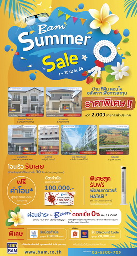 BAM จัดแคมเปญรับลมร้อน “BAM Summer Sale” ระหว่างวันที่ 1-30 เมษายน 2565 นำอสังหาฯ ราคาพิเศษ กว่า 2,000 รายการ ทั่วประเทศ พร้อมโปรโมชั่น “โอนเร็ว รับฟรีค่าโอนฯ มูลค่าสูงสุด 9 แสนบาท และบัตรกำนัลสูงสุด 1 แสนบาท” โปรพิเศษ! ซื้อทรัพย์ รับฟรี พัดลมทาวเวอร์ HATARI มูลค่าไม่เกิน 2,000 บาท – ลูกค้าซื้อทรัพย์ผ่อนชำระกับ BAM ดอกเบี้ย 0% นาน 12 เดือน พิเศษสุด ลูกค้าจองซื้อทรัพย์ออนไลน์รับบัตรกำนัลสูงสุด 2 หมื่นบาท หรือซื้อผ่านแพลตฟอร์ม Shopee – Lazada รับ Discount Code มูลค่าสูงสุด 2 หมื่นบาท