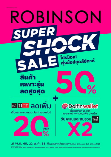 ห้างสรรพสินค้าโรบินสัน ในเครือเซ็นทรัล รีเทล จัดแคมเปญช้อปสนุกเพื่อครอบครัวนักช้อปทั่วไทย กับแคมเปญ “ROBINSON SUPER SHOCK SALE” (โรบินสัน ซูเปอร์ ช็อก เซล) พบโปรโมชั่นสุดช็อกมากมาย ตั้งแต่วันที่ 21 พ.ค. 65 – 22 พ.ค. 65 เพียง 2 วันเท่านั้น! ไม่ว่าจะเป็น…