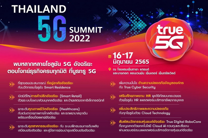 กลุ่มทรู จัดทัพใหญ่ ยกขบวนโซลูชัน 5G อัจฉริยะ เสริมแกร่งธุรกิจ ในงาน Thailand 5G Summit 2022 วันที่ 16-17 มิ.ย. 65 ณ โรงแรมเซ็นทารา แกรนด์ และ บางกอก คอนเวนชัน เซ็นเตอร์ เซ็นทรัลเวิลด์