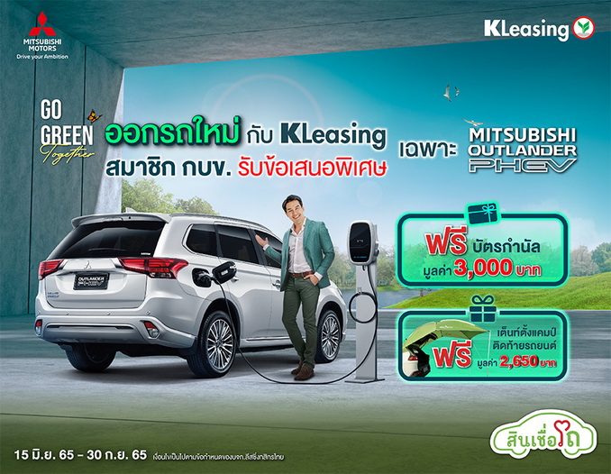 สำหรับธนาคารกสิกรไทย จากที่ได้เปิดตัวโครงการ GO GREEN Together โดยเป็นธนาคารแรกที่เชื่อมโยงและผลักดันให้เกิด Green Ecosystem อย่างครบวงจรและเกิด Green Lifestyle ขึ้นจริงในประเทศไทย ลีสซิ่งกสิกรไทยจึงตอบรับนโยบาย โดยขยายความร่วมมือกับมิตซูบิชิ มอเตอร์ส ประเทศไทย มอบข้อเสนอพิเศษสำหรับสมาชิกและครอบครัวของสมาชิกกองทุนบำเหน็จบำนาญข้าราชการ (กบข.) ทั่วประเทศ เมื่อซื้อรถยนต์มิตซูบิชิ เอาท์แลนเดอร์ พีเอชอีวี และยื่นสมัครสินเชื่อรถ (รถใหม่) กับลีสซิ่งกสิกรไทย ตั้งแต่วันนี้ถึงวันที่ 30 กันยายน 2565 และได้รับการอนุมัติและเกิดเป็นสัญญาเช่าซื้อภายในวันที่ 31 ตุลาคม 2565 รับของสมนาคุณจากลีสซิ่งกสิกรไทย เต็นท์ตั้งแคมป์ติดท้ายรถยนต์แบบพกพา 1 ชิ้น มูลค่า 2,650 บาท และบัตรกำนัล Lotus’s มูลค่า 3,000 บาท ต่อการซื้อรถยนต์ 1 คัน พร้อมรับสิทธิพิเศษอีกมากมาย จากผู้จำหน่ายรถยนต์มิตซูบิชิที่ได้รับการแต่งตั้งอย่างเป็นทางการและผ่านมาตรฐานการซ่อมบำรุงรถ มิตซูบิชิ เอาท์แลนเดอร์ พีเอชอีวี