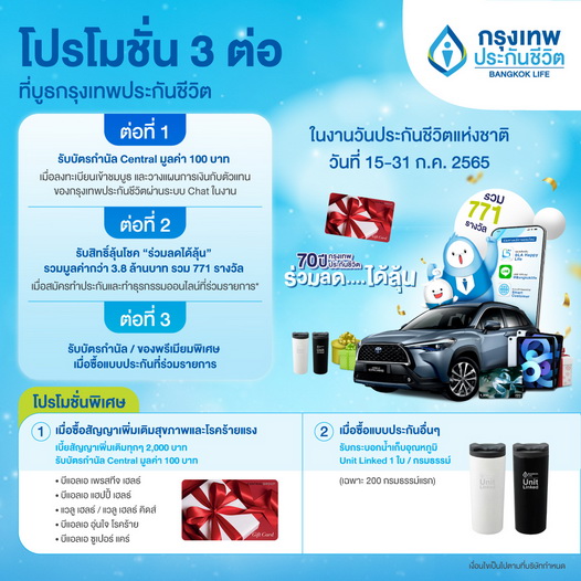 และพบกับโปรโมชั่นสุดพิเศษที่บูธกรุงเทพประกันชีวิต รับสิทธิพิเศษถึง 3 ต่อ ดังนี้