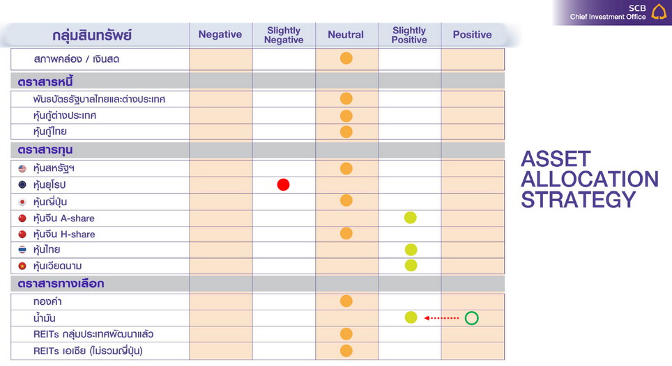 นอกจากนี้ SCB CIO ยังคงแนะนำให้มีสินค้าโภคภัณฑ์ ประมาณ 4-6% ของ portfolio เพื่อเป็นการจัดการความเสี่ยงเงินเฟ้อ โดยเน้นที่น้ำมันซึ่งยังมีความตึงตัวของอุปทาน รวมถึงอุปสงค์น้ำมันโลกในช่วงครึ่งหลังของปียังคงมีแนวโน้มสูงขึ้นจากการเปิดเมืองเปิดประเทศโดยเฉพาะในเอเชีย อย่างไรก็ตามเราปรับสินค้าโภคภัณฑ์ ลงเป็น slightly positive เพื่อสะท้อนความกังวลภาวะเศรษฐกิจถดถอยที่จะมีผลต่ออุปสงค์สินค้าโภคภัณฑ์ ค่าเงินดอลลาร์สหรัฐฯที่ยังอยู่ในระดับสูง โดยผลกระทบจะมีค่อนข้างมากกับสินค้าที่ไม่ได้มีความตึงตัวในอุปทานในระยะข้างหน้า เช่น ทองแดง  สำหรับลูกค้า HNW และ UHNW การมี Alternative assets เช่น Structure note และ Private asset อยู่ใน Portfolio จะช่วยสร้างกระแสรายได้และลดความผันผวนของ Portfolio ได้