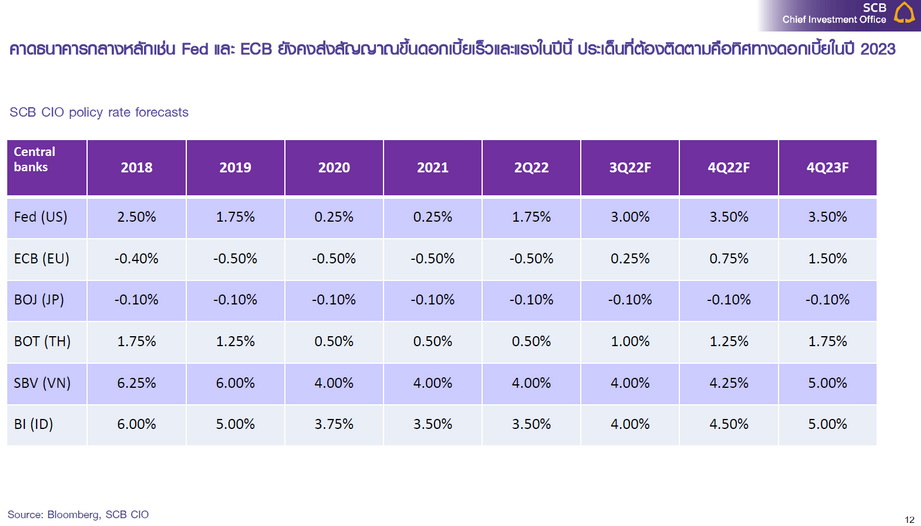 SCB CIO คาดการชะลอตัวลงของราคาสินค้าโภคภัณฑ์เป็นสัญญาณว่าเงินเฟ้อใกล้ผ่านจุดสูงสุด แต่การลดลงของเงินเฟ้ออาจลดลงไม่เร็วและยังอยู่ในระดับสูง ทำให้การขึ้นดอกเบี้ยนโยบายของธนาคารกลางหลัก ยังเป็นแบบเร็วและแรงต่อไปในช่วงครึ่งหลังของปี ความกังวลต่อภาวะเศรษฐกิจถดถอยเริ่มขยับสูงขึ้น การลงทุนในสินทรัพย์เสี่ยงแนะรอความชัดเจนจากผลประกอบการไตรมาสที่ 2 ซึ่งจะสะท้อนว่าบริษัทจดทะเบียนปรับตัวได้มากน้อยแค่ไหนจากผลกระทบเงินเฟ้อและดอกเบี้ยขาขึ้น