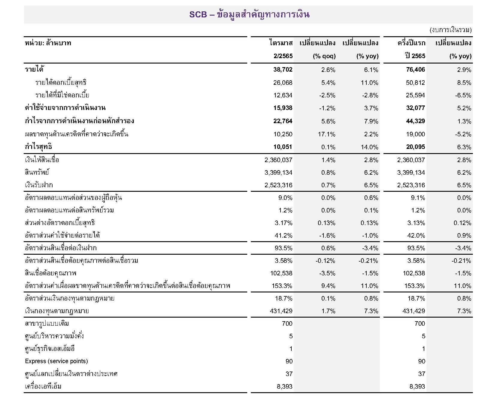 บริษัท เอสซีบี เอกซ์ จำกัด (มหาชน) มีกำไรสุทธิในไตรมาส 2 ของปี 2565 จำนวน 10,051 ล้านบาท เพิ่มขึ้น 14.0% จากช่วงเดียวกันของปีก่อน ในขณะที่กำไรจากการดำเนินงานก่อนหักสำรองมีจำนวน 22,764 ล้านบาท ปรับตัวเพิ่มขึ้น 7.9% จากช่วงเดียวกันของปีก่อน ซึ่งเป็นผลของการขยายตัวของฐานรายได้ดอกเบี้ยสุทธิ สำหรับครึ่งปีแรกของปี 2565 บริษัทฯ มีกำไรสุทธิจำนวน 20,095 ล้านบาท เพิ่มขึ้น 6.3% จากช่วงเดียวกันของปีก่อน