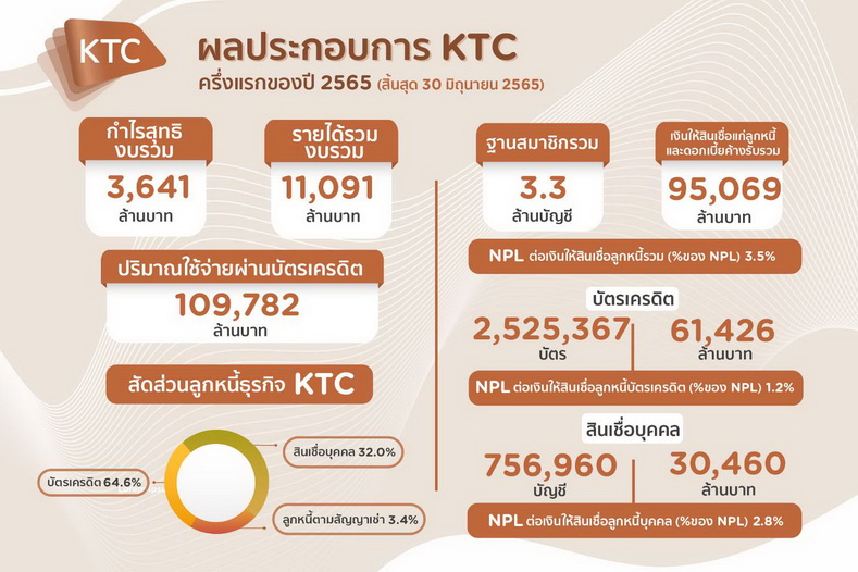 “ผลการดำเนินงานของเคทีซีในช่วงครึ่งปีแรก สิ้นสุดวันที่ 30 มิถุนายน 2565 เปรียบเทียบกับช่วงเดียวกันของปี 2564 งบการเงินรวมมีกำไรสุทธิครึ่งปีแรกและไตรมาส 2/2565 เท่ากับ 3,641 ล้านบาท (เพิ่มขึ้น 9.9%) และ 1,894 ล้านบาท (เพิ่มขึ้น 12.7%) ตามลำดับ งบการเงินเฉพาะกิจการของเคทีซี มีกำไรสุทธิครึ่งปีแรก และไตรมาส 2/2565 เท่ากับ 3,621 ล้านบาท (เพิ่มขึ้น 9.5%) และ 1,870 ล้านบาท (เพิ่มขึ้น 11.7%) ตามลำดับ ฐานสมาชิกรวม 3.3 ล้านบัญชี เงินให้สินเชื่อแก่ลูกหนี้และดอกเบี้ยค้างรับรวม 95,069 ล้านบาท อัตราส่วนสินเชื่อด้อยคุณภาพต่อเงินให้สินเชื่อรวม (NPL) 3.5% แบ่งเป็นพอร์ตสมาชิกบัตรเครดิต 2,525,367 บัตร เงินให้สินเชื่อแก่ลูกหนี้บัตรเครดิตและดอกเบี้ยค้างรับรวม 61,426 ล้านบาท ปริมาณการใช้จ่ายผ่านบัตรครึ่งปีแรกเท่ากับ 109,782 ล้านบาท เพิ่มขึ้น 16.6% (สูงกว่าช่วงก่อนเกิดโควิด ซึ่งครึ่งแรกของปี 2562 มีมูลค่า 100,282 ล้านบาท) NPL บัตรเครดิตอยู่ที่ 1.2% พอร์ตสมาชิกสินเชื่อบุคคลเคทีซี 756,960 บัญชี เงินให้สินเชื่อแก่ลูกหนี้สินเชื่อบุคคลและดอกเบี้ยค้างรับรวม 30,460 ล้านบาท NPL สินเชื่อบุคคลอยู่ที่ 2.8% และพอร์ตลูกหนี้ตามสัญญาเช่ามูลค่า 3,184 ล้านบาท ยอดสินเชื่อลูกหนี้ใหม่ (New Booking) ของสินเชื่อ “เคทีซี พี่เบิ้ม” และกรุงไทยธุรกิจ ลีสซิ่ง (KTBL) สำหรับครึ่งแรกของปี 2565 มียอดรวม 525 ล้านบาท โดยที่ยอดลูกหนี้มีแนวโน้มเพิ่มขึ้นทุกเดือนตั้งแต่ต้นปีที่ผ่านมา”