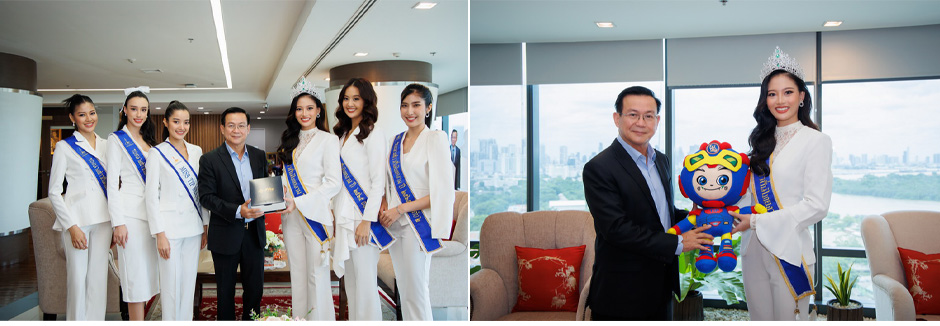 ดร.สมพร สืบถวิลกุล ประธานเจ้าหน้าที่บริหาร บมจ.ทิพย กรุ๊ป โฮลดิ้งส์ และ กรรมการผู้จัดการใหญ่ บมจ. ทิพยประกันภัย ให้การต้อนรับน้องมิ้ว สุจารี กาญจนกฤต นางสาวถิ่นไทยงาม ประจำปี 2565 และรองทั้ง 4 ที่นำทีมเข้าแสดงความขอบคุณ ทิพยประกันภัยที่ให้การสนับสนุนการประกวด