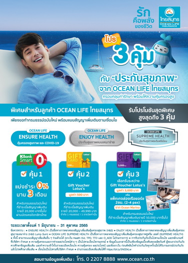 บมจ.ไทยสมุทรประกันชีวิต รักคือพลังของชีวิต โดย คุณนุสรา (อัสสกุล) บัญญัติปิยพจน์ ประธานเจ้าหน้าที่บริหาร และกรรมการผู้จัดการ (CEO) เดินหน้าส่งพลังความรักดูแลคนไทยผ่านวิกฤตอย่างยั่งยืน ด้วยการสนับสนุนการดูแลสุขภาพ พร้อมมอบความสุขตอบแทนลูกค้า โดยการคัดสรรผลิตภัณฑ์ประกันสุขภาพที่หลากหลายตอบโจทย์ทุกความต้องการในทุกระดับ มาให้เลือกช้อปกันอย่างจุใจ พร้อมโปรสุดคุ้มเอาใจสาย Healthy ที่ต้องการเติมเต็มความคุ้มครองด้วยแคมเปญ “โปรโมชัน 3 คุ้ม กับที่สุดของประกันสุขภาพ” จาก OCEAN LIFE ไทยสมุทร สำหรับลูกค้าที่ขอทำกรมธรรม์ฉบับใหม่ พร้อมแนบสัญญาเพิ่มเติมตามที่กำหนด* เมื่อลูกค้าชำระเบี้ยประกันภัยรายปี ปีแรกงวดแรก ตั้งแต่วันนี้ – 31 ตุลาคม 2565 รับไปเลยสิทธิ์ทั้งรับทั้งลุ้นถึง 3 คุ้ม คุ้มที่ 1 แบ่งชำระ 0% นาน 3 เดือน สำหรับกรมธรรม์ที่ชำระเบี้ยสัญญาเพิ่มเติมรายปี 20,000 บาทขึ้นไป ผ่านบัตรเครดิตธนาคารกสิกรไทย คุ้มที่ 2  รับไปเลย Gift Voucher Lotus’s มูลค่า 500 บาทสำหรับกรมธรรม์ที่ชำระเบี้ยสัญญาเพิ่มเติมรายปี 20,000 – 49,999 บาท (จำกัด 1 กรมธรรม์ /1 รางวัลเท่านั้น) คุ้มที่ 3  รับ Gift Voucher Lotus’s มูลค่า 3,000 บาท หรือ แพ็กเกจล่องเรือยอร์ชจาก Ocean Marina 2 ชั่วโมง มูลค่า 6,500 บาท สำหรับกรมธรรม์ที่ชำระเบี้ยสัญญาเพิ่มเติมรายปี 50,000 บาท ขึ้นไป (จำกัด 1 กรมธรรม์ /1 รางวัลเท่านั้น)