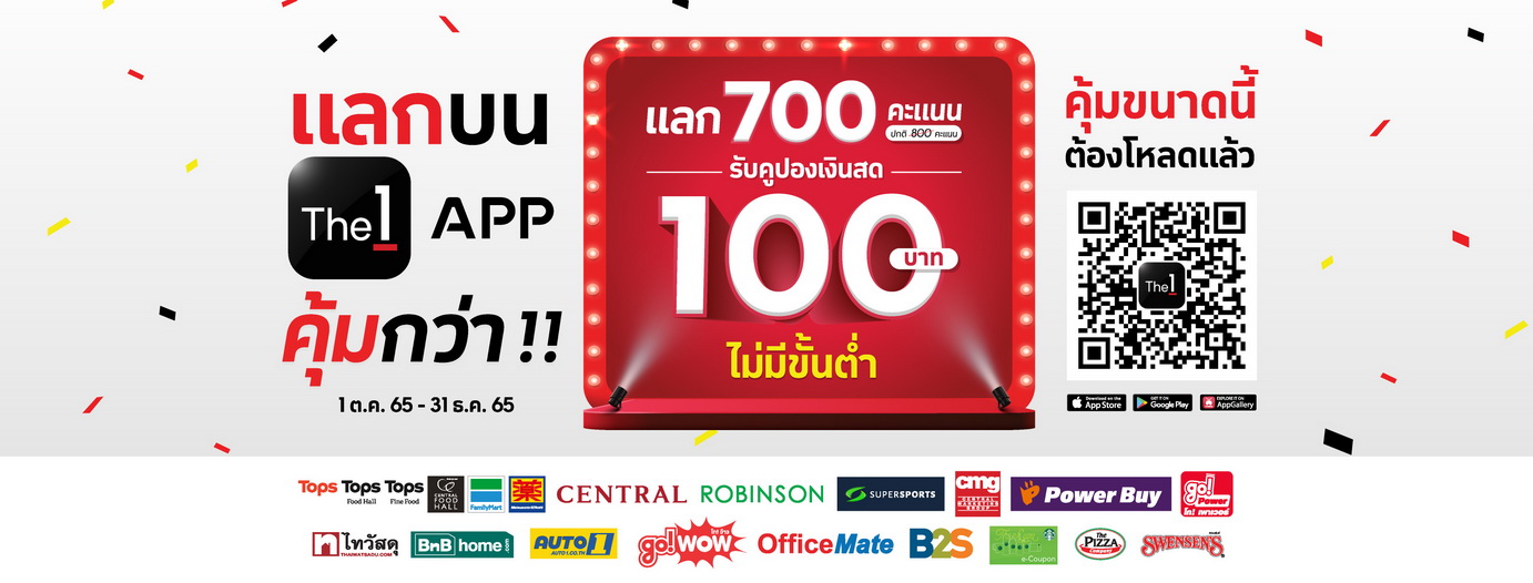 The 1 มุ่งสานต่อพันธกิจที่จะมอบความคุ้มค่าในการช้อปผ่าน The 1 APP ด้วยแคมเปญล่าสุด “แลกบน The 1 APP คุ้มกว่า” ที่ได้ขยายและรวบรวมเอาดีลที่ดีที่สุดตลอดปีมานำเสนอให้กับสมาชิก The 1 โดยจับมือกับแบรนด์พาร์ทเนอร์ทั้งในและนอกเครือเซ็นทรัลที่ต่างยกขบวนดีลที่ครอบคลุมทุกความต้องการที่สุดตลอดปี สามารถแลกได้ในทุกๆ วัน ทุกที่ทุกเวลา และครอบคลุมทุกความสนใจ เริ่มต้นที่รีวอร์ดที่มาในเรตพิเศษสุด 700 คะแนน แลกรับส่วนลด 100 บาท (จากปกติ 800:100) ไม่มีขั้นต่ำในการใช้คูปอง สมาชิก The 1 สามารถเลือกแลกได้จากทั้ง The 1, Central, Tops, Robinson, Supersports, Power Buy, go!WOW, BnB home, AUTO 1, Thai Watsadu, B2S, CMG, FamilyMart, OfficeMate, Starbucks, Swensen’s และ The Pizza Company ตั้งแต่วันนี้ – 31 ธ.ค. 2565 นอกจากนี้ยังมีรีวอร์ดหลากหลายจากพาร์ทเนอร์มากมายกว่า 2,000 แบรนด์ที่สับเปลี่ยนหมุนเวียนกันมามอบสิทธิพิเศษให้กับสมาชิก The 1 ผ่าน The 1 APP โดยเฉพาะ