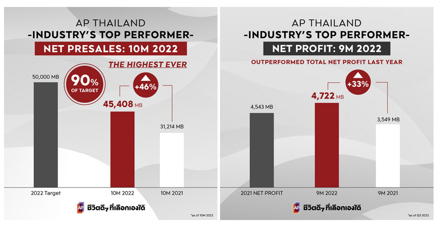 นอกจากนี้บริษัทฯ ยังมีผลงานยอดขายที่แข็งแกร่ง และยังคงสร้าง New Record สูงสุดที่บริษัทเคยทำได้ ณ สิ้นเดือนตุลาคมที่ผ่านมา บริษัทฯ มียอดขายมากถึง 45,408 ล้านบาท หรือคิดเป็น 90% ของเป้ายอดขายที่ตั้งไว้ที่ 50,000 ล้านบาท เติบโตขึ้น 46% หากเทียบกับช่วงเดียวกันของปีก่อนหน้า แบ่งเป็นยอดขายจากสินค้าบ้านเดี่ยวและทาวน์โฮมที่ 36,154 ล้านบาท เพิ่มขึ้น 26% และเป็นยอดขายจากสินค้าแนวสูงที่ปรับตัวดีขึ้นอย่างชัดเจนที่ 9,254 ล้านบาท เพิ่มขึ้นจากปีก่อนหน้ากว่า 3 เท่าตัว โดยปัจจัยที่สนับสนุนให้บริษัทฯ ประสบความสำเร็จในมิติยอดขายที่แข็งแกร่ง นอกจากความเชื่อมั่นของลูกค้าต่อแบรนด์สินค้าเครือเอพีที่มากกว่า 17 แบรนด์ ที่มุ่งมั่นพัฒนาที่อยู่อาศัยที่เข้าใจความต้องการที่แท้จริงของลูกค้า เพื่อส่งมอบความปรารถนาในการใช้ชีวิตที่แตกต่างกัน ให้ทุกนิยามความสุขที่ต้องการเกิดขึ้นได้จริงแล้ว และยังสะท้อนถึงดีมานด์ตลาดที่อยู่อาศัยที่ยังคงเป็นที่ต้องการ ทั้งตลาดบ้านแนวราบที่เติบโตต่อเนื่อง และโดยเฉพาะตลาดคอนโดฯ ที่มีการฟื้นคืนกลับของลูกค้าอย่างเห็นได้ชัด