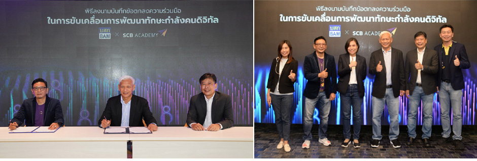 SCB Academy ธนาคารไทยพาณิชย์ ร่วมลงนามบันทึกข้อตกลงความร่วมมือทางธุรกิจในการขับเคลื่อนการพัฒนาทักษะกำลังคนดิจิทัล กับบริษัทบริหารสินทรัพย์ กรุงเทพพาณิชย์ จำกัด (มหาชน) หรือ BAM วางหลักสูตรขับเคลื่อนการพัฒนาทักษะกำลังคนดิจิทัล เตรียมพร้อมการทำงานในโลกอนาคต สอดรับกับเป้าหมายของ BAM ที่มุ่งสู่การเป็นองค์กรที่ขับเคลื่อนด้วยข้อมูล (Data Driven Organization)