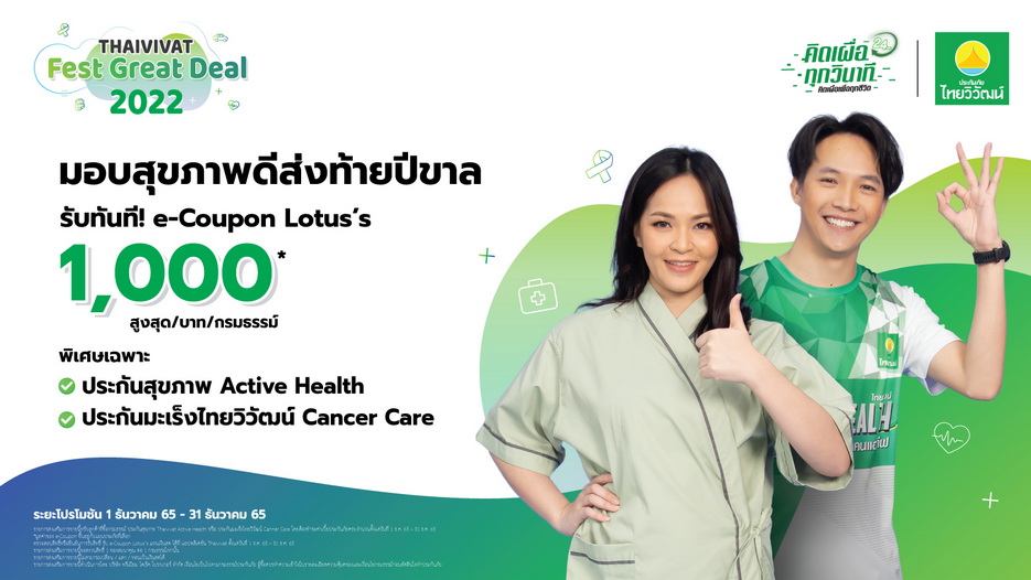 มาพร้อมกับสิทธิพิเศษสำหรับสายรักสุขภาพ มอบ e-Coupon Lotus’s แทนเงินสดมูลค่าสูงสุด 1,000 บาท* เมื่อซื้อประกันสุขภาพ  Active Health หรือประกันมะเร็ง Cancer Care (รายปี) ทุกแผนความคุ้มครอง โดยเมื่อชำระค่าเบี้ยประกันภัยครบจำนวนแล้ว สามารถตรวจสอบสิทธิ์หรือยืนยันการรับสิทธิ์ รับ e-Coupon Lotus’s แทนเงินสด ได้ที่ แอปพลิเคชัน Thaivivat ตั้งแต่วันที่ 1 ธันวาคม 2565 – 31 ธันวาคม 2565 สนใจรายละเอียดคลิก https://thaivivat.info/3F940bd