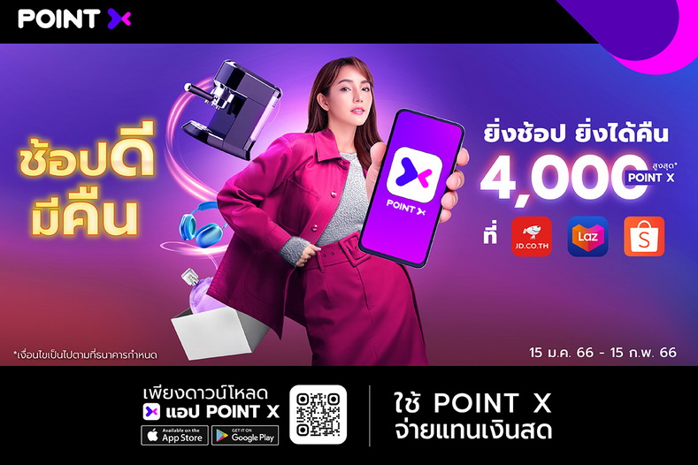 จ่ายด้วย PointX ที่ JD CENTRAL, Lazada, Shopee รับพอยท์คืนสูงสุด 4,000 PointX พร้อมรับสิทธิ์ลดหย่อนภาษีสูงสุด 40,000 บาท