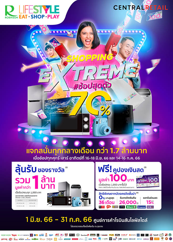 ศูนย์การค้าโรบินสันไลฟ์สไตล์ ในเครือเซ็นทรัล รีเทล ตอกย้ำการเป็นเดสติเนชั่นแห่งความสนุกของทุกครอบครัวทั่วไทย ส่งแคมเปญใหญ่ปลุกกำลังซื้อกลางปี กับ ROBINSON LIFESTYLE SHOPPING EXTREME” #ช้อปสุดตัว ยกขบวนสินค้าแบรนด์ดังลดราคาแบบจัดหนัก ช้อปสะเทือนกระเป๋ากันแบบจัดเต็ม ชูคอนเซ็ปต์ Extreme Marketing & Promotion ลดแบบตะโกนให้รู้ว่าลด จับมือพาร์ทเนอร์กว่าหลายร้อยแบรนด์ ลดสูงสุด 70% พร้อมดีลพิเศษสุดเอกซ์คลูซิฟ และแจกสนั่นของรางวัลมูลค่ารวมกว่า 1.7 ล้านบาท ตั้งเป้ากระตุ้นเศรษฐกิจส่งท้ายไตรมาส 2 คึกคักเสริมสภาพคล่องการซื้อสินค้าอุปโภคบริโภคในครัวเรือน ตั้งแต่วันที่ 1 มิ.ย. – 31 ก.ค. 66  ที่ศูนย์การค้าโรบินสันไลฟ์สไตล์ 27 สาขาทั่วประเทศ