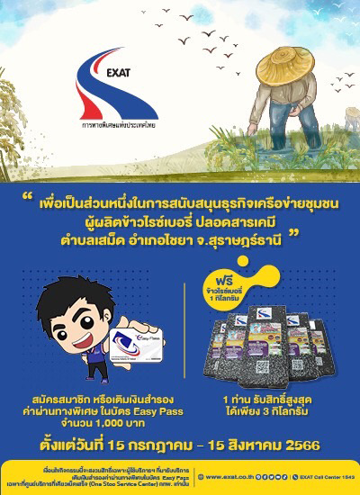 การทางพิเศษแห่งประเทศไทย ร่วมเป็นส่วนหนึ่งในการสนับสนุนธุรกิจเครือข่ายชุมชน จัดกิจกรรมสร้างสรรค์ เพียงสมัครสมาชิกหรือเติมเงินสำรองค่าผ่านทางในบัตร Easy Pass จำนวน 1,000 บาท  รับทันที ข้าวไรซ์เบอร์รี่ ตั้งแต่วันนี้ จนถึง 15 ส.ค. 66, วันที่ 16 ส.ค. – 15 ก.ย 66 รับกระเป๋าผ้ามัดย้อม และ วันที่ 16 ก.ย. – 15 ต.ค. 66 รับกระเป๋ากระจูด ที่จุดบริการที่เดียวเบ็ดเสร็จ (One Stop Service Center) ณ การทางพิเศษแห่งประเทศไทย