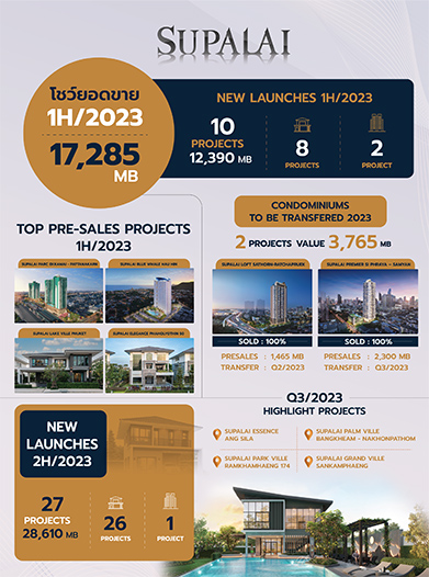 นายไตรเตชะ ตั้งมติธรรม กรรมการผู้จัดการ บริษัท ศุภาลัย จำกัด (มหาชน) กล่าวว่า ผลการดำเนินธุรกิจในช่วงครึ่งปีแรก 2566 บริษัทฯ ยังคงรักษาการเติบโตที่มั่นคงอย่างต่อเนื่อง ดีมานด์ตอบรับดีทั้งสินค้าแนวราบและคอนโดมิเนียม สามารถสร้างยอดขายรวมได้แล้วถึง 17,285 ล้านบาท คิดเป็น 48% จากเป้าหมายยอดขาย 36,000 ล้านบาท แบ่งเป็นสัดส่วนยอดขายโครงการแนวราบ 11,304 ล้านบาท และโครงการคอนโดมิเนียมที่เปิดใหม่และสร้างเสร็จพร้อมอยู่ 5,981 ล้านบาท โดยมาจากการตอบรับที่ดีของลูกค้าในทุกทำเลโครงการที่มีสินค้าสร้างเสร็จพร้อมอยู่ รวมถึงโครงการที่เปิดตัวใหม่ ทั้งนี้ยอดขายที่เพิ่มขึ้นมาจากโครงการภูมิภาคของศุภาลัย ยังคงได้รับความสนใจและเติบโตโดดเด่นอย่างต่อเนื่อง ทั้งยอดขายคอนโดมิเนียม 570 ล้านบาท เติบโต 72% โครงการแนวราบ 7,214 ล้านบาท เติบโต 6% เมื่อเทียบกับยอดขายครึ่งปี 2565 ทั้งนี้ โครงการใหม่ที่สามารถสร้างยอดขายได้อย่างต่อเนื่อง อาทิ ศุภาลัย ปาร์ค เอกมัย – พัฒนาการ, ศุภาลัย บลูเวล หัวหิน, ศุภาลัย เอเลแกนซ์ พหลโยธิน 50 และ ศุภาลัย เลค วิลล์ ภูเก็ต นอกจากนี้บริษัทฯ ยังมีสินค้าสร้างเสร็จพร้อมเข้าอยู่ในมือทั้งโครงการแนวราบและคอนโดมิเนียม มูลค่ามากกว่า 20,000 ล้านบาท ซึ่งคาดว่าจะเข้ามารองรับการเติบโตของยอดขายในครึ่งปีหลัง โดยล่าสุดในไตรมาส 2 ที่ผ่านมา โครงการศุภาลัย ลอฟท์ สาทร – ราชพฤกษ์” ได้เปิดให้ลูกค้าเข้าตรวจรับห้องชุดและได้รับการตอบรับจากลูกค้าทยอยโอนกรรมสิทธิ์ห้องชุดไปแล้ว ประมาณ 75%