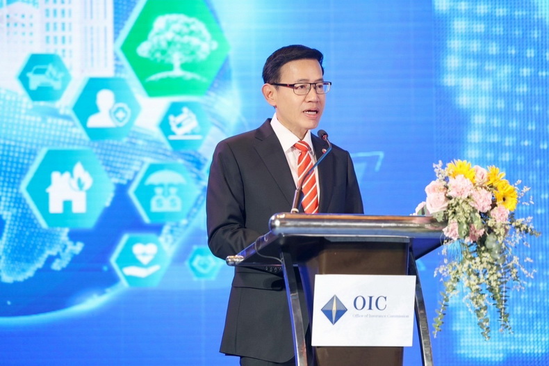 จากนั้น ดร.สุทธิพล ทวีชัยการ เลขาธิการคณะกรรมการกำกับและส่งเสริมการประกอบธุรกิจประกันภัย(เลขาธิการ คปภ.) ได้กล่าวบรรยายพิเศษในหัวข้อ “การประกันภัยอย่างยั่งยืน โอกาสใหม่ในการเสริมสร้างความเข้มแข็งและการเติบโตของธุรกิจประกันภัยไทย” โดยมีใจความตอนหนึ่งว่า ในช่วง 2-3 ปีที่ผ่านมา อุตสาหกรรมประกันภัยต้องเผชิญกับการเปลี่ยนแปลงมากมาย ทั้งเรื่องของความก้าวหน้าของเทคโนโลยีที่มีการเปลี่ยนแปลงอย่างก้าวกระโดด ความผันผวนของระบบเศรษฐกิจ ความไม่แน่นอนทางการเมืองระหว่างประเทศ รวมทั้งการแพร่ระบาดของโรคติดเชื้อโควิด 19 ที่ส่งผลกระทบต่อความเข้มแข็งมั่นคงและการเติบโตอย่างยั่งยืนของระบบประกันภัย ซึ่งธุรกิจประกันภัยกำลังเผชิญกับโอกาสและความท้าทายหลากหลายประการ สำนักงาน คปภ. ให้ความสำคัญและส่งเสริมการสร้างสมดุลและความยืดหยุ่นให้กับระบบประกันภัยมาโดยตลอด เพื่อให้ธุรกิจประกันภัยสามารถรับมือกับความเสี่ยงได้อย่างมีประสิทธิภาพ นอกเหนือจากเงินกองทุนที่เข้มแข็งแล้ว แนวทางสำคัญที่จะสร้างสมดุลและความยืดหยุ่นในระบบประกันภัย ยังประกอบไปด้วย การกระจายความเสี่ยง การเพิ่มประสิทธิภาพในการบริหารความเสี่ยง การเร่งประยุกต์ใช้เทคโนโลยีและฐานข้อมูล การลงทุนในทรัพยากรบุคลากร และการยกระดับความพร้อมรับมือภัยคุกคามทางไซเบอร์ นอกเหนือจากการสร้างสมดุลและความยืดหยุ่นแล้ว อีกประเด็นสำคัญ คือ การสร้างการเติบโตอย่างยั่งยืน (Sustainability) ให้แก่ธุรกิจประกันภัย สำนักงาน คปภ. จึงได้ผลักดันให้มีการผนวกเรื่อง ESG เป็นส่วนหนึ่งของนโยบายและกลยุทธ์ในการประกอบธุรกิจอย่างเป็นรูปธรรม ซึ่งธุรกิจประกันภัย ถือได้ว่ามีส่วนสำคัญในการสนับสนุนและการดำเนินกิจกรรมที่เกี่ยวกับเศรษฐกิจสีเขียว (Green Economy) และผลักดันให้เกิดการดำเนินธุรกิจอย่างยั่งยืน (Sustainability) ในฐานะผู้รับประกันภัยที่พัฒนาผลิตภัณฑ์ประกันภัยเพื่อรองรับความเสี่ยง