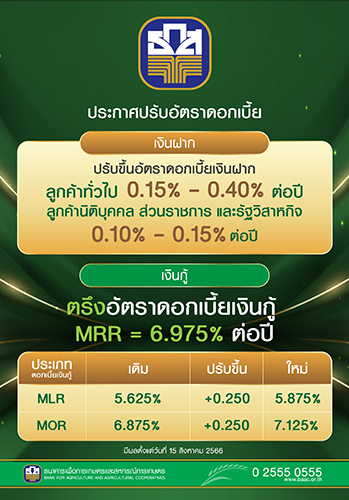 ธ.ก.ส. ประกาศปรับขึ้นอัตราดอกเบี้ยเงินฝากประจำ สูงสุดร้อยละ 0.40 ต่อปี และปรับอัตราดอกเบี้ยเงินกู้ MLR และ MOR ร้อยละ 0.25 ต่อปี โดยมีผลตั้งแต่ 15 ส.ค. 66 เป็นต้นไป เพื่อให้สอดคล้องกับทิศทางอัตราดอกเบี้ยในตลาดที่ปรับขึ้นตามอัตราดอกเบี้ยนโยบาย แต่ยังตรึงอัตราดอกเบี้ย MRR สำหรับเกษตรกรรายย่อย เพื่อลดภาระและสนับสนุนการฟื้นตัวตามภาวะเศรษฐกิจ พร้อมวางแนวทางในการดูแลลูกค้าผ่านการบริหารจัดการหนี้ การให้คำปรึกษาทั้งหนี้ในและนอกระบบผ่านโครงการมีหนี้นอกบอก ธ.ก.ส. ควบคู่กับการเติมสินเชื่อใหม่ในอัตราดอกเบี้ยผ่อนปรน เพื่อเป็นค่าใช้จ่ายหมุนเวียนและเสริมสภาพคล่องในการลงทุน
