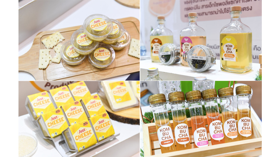 ภายในบูธของ CPF RD Center นำเสนอ 3 ผลงานวิจัยด้านอาหาร ประกอบด้วย Just-Cheese ชีสวีแกนทำจากปลายข้าวหมักด้วยกระบวนการชีวภาพด้วยเชื้อยีสต์สายพันธ์คัดแยกพิเศษที่ให้กลิ่นและอะมิโน เป็นผลพลอยได้จากกระบวนการสีข้าวที่มีมูลค่าน้อยลง แต่ยังอุดมด้วยโปรตีน แร่ธาตุ ไขมัน และวิตามิน การแปรรูปเป็น “ชีส” ไขมันต่ำ มีคุณค่าโภชนาการสูง  ช่วยตอบโจทย์คนรุ่นใหม่ที่ชื่นชอบชีส และผู้ที่รับประทานมังสวิรัติ ขณะเดียวกัน ยังมีรสชาติอร่อยเหมือนชีสที่ทำจากนม เพิ่มทางเลือกให้กับผู้ที่แพ้นม ได้อีกด้วย