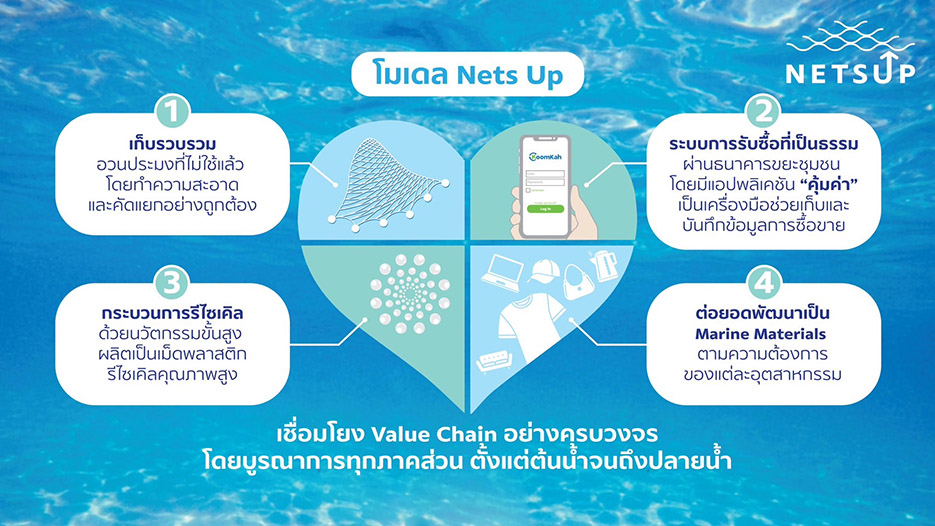 โมเดล “Nets Up” ได้เชื่อมโยงโซ่คุณค่า (Value Chain) อย่างครบวงจร โดยเริ่มต้นที่การจัดการอวนประมงที่ไม่ใช้แล้ว และนำเข้าระบบการซื้อขายของธนาคารขยะชุมชน ผ่านแอปพลิเคชัน “คุ้มค่า” จากนั้นจึงเข้าสู่กระบวนการรีไซเคิลเป็นเม็ดพลาสติกรีไซเคิลคุณภาพสูง และพัฒนาเป็น Marine Materials วัสดุรีไซเคิลจากอวนประมงไม่ใช้แล้ว เช่น วัสดุผ้าในธุรกิจสิ่งทอ บรรจุภัณฑ์ อุปกรณ์รองเท้ากีฬา ชิ้นส่วนยานยนต์ อุปกรณ์ไฟฟ้า เป็นต้น