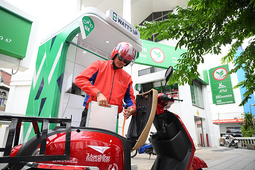 ธนาคารกสิกรไทย ร่วมกับไปรษณีย์ไทย และเอช เซม มอเตอร์ (HSEM) นำร่องโครงการ WATT’S UP แพลตฟอร์มให้เช่ารถจักรยานยนต์ไฟฟ้าหรือ EV Bike แบบครบวงจร สามารถจอง และจ่ายเงินได้ภายในแอปเดียว เริ่มใช้กับพนักงานไปรษณีย์ไทย 3 สาขา เพื่อสนับสนุนการใช้รถจักรยานยนต์ไฟฟ้าซึ่งจะช่วยลดการปล่อยก๊าซเรือนกระจกและลดมลภาวะจากฝุ่น PM2.5 ซึ่งจะเป็นการผลักดันให้เกิด Green Ecosystem อย่างยั่งยืน ทั้งยังช่วยลดค่าใช้จ่ายให้ธุรกิจ ตั้งเป้าเปิดให้ประชาชนทั่วไปได้ใช้แพลตฟอร์ม WATT’S UP ภายในต้นปี 2567